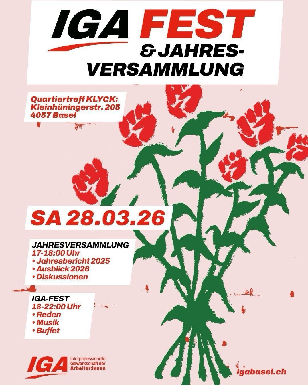 Am Samstag 5. April machen wir, die Interprofessionelle Gewerkschaft der Arbeiter:innen, unsere Jahresversammlung mit anschliessendem Fest. An der Jahresversammlung werden wir den Jahresbericht vorstellen, einen Ausblick geben und gemeinsam mit unseren Mitgliedern einige Entscheidungen treffen. Danach gibt es ein Buffet, Musik und einige Redebeiträge.
